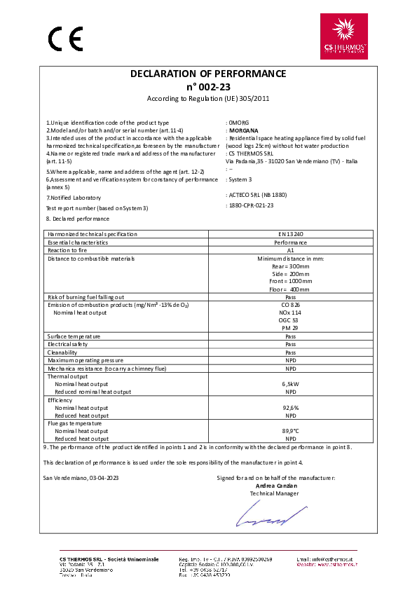 This product complies with the Class 4 Stars, according to the emission and performance requirements of the Decree of 7 November 2017, n°186 (Italy).