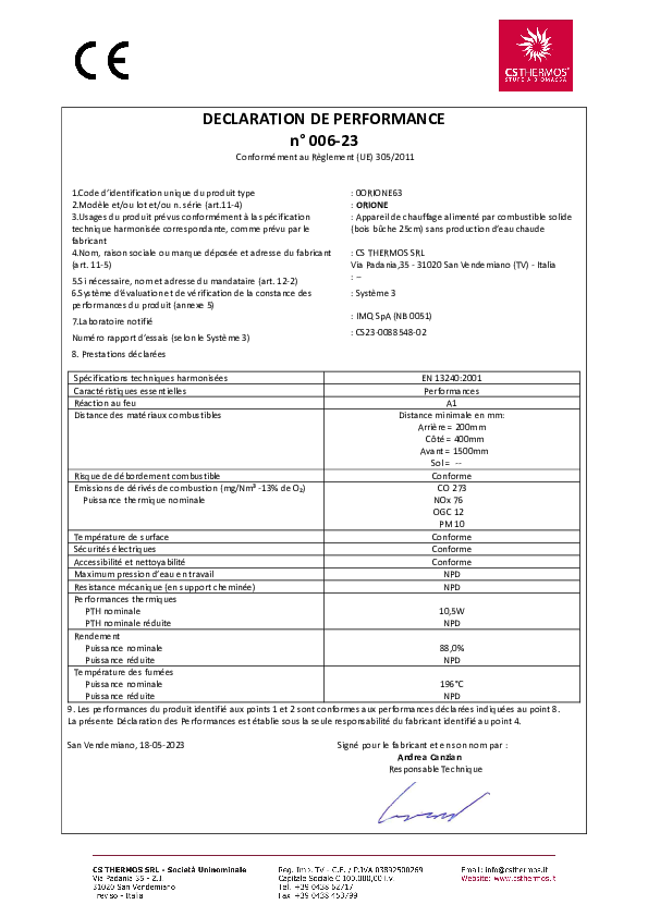 Ce produit est conforme à la Classe 5 Étoiles, conformément aux exigences d'émission et de performance du Décret n°186 du 4 Novembre 2017 (Italie).
