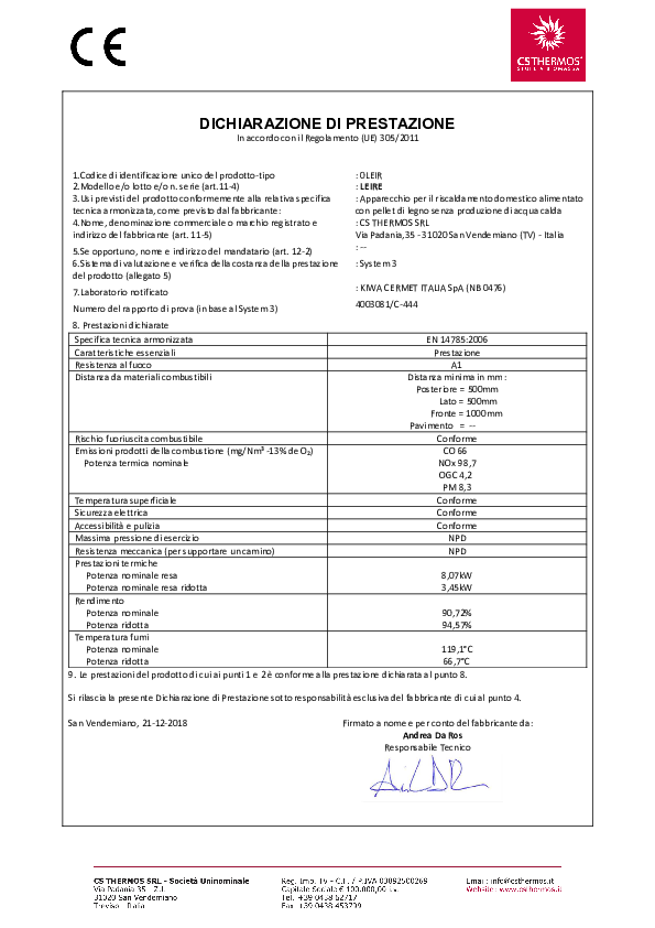 Questo prodotto è conforme alla Classe 5 Stelle secondo i requisiti di emissioni e rendimento del Decreto 7 Novembre 2017, n. 186
