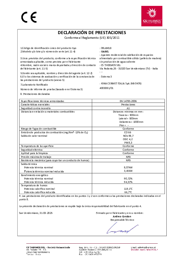 Questo prodotto è conforme alla Classe 5 Stelle secondo i requisiti di emissioni e rendimento del Decreto 7 Novembre 2017, n. 186