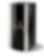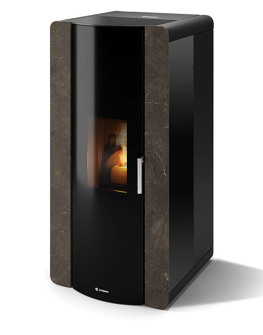 Termostufa ecologica a pellet realizzata con struttura in acciaio, top e fianchi in vetro serigrafato nero e facciata in pietra, in 4 versioni colore moderne e di design: forme pulite e materiali di pregio, per una visione gradevole anche a fiamma spenta.